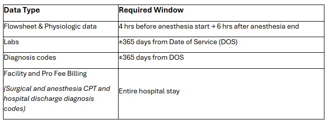 Participation in MPOG requires extraction of core data from the EHR and, in some cases, supplemental systems. Due to variation across EHR vendors and implementations, sites may contribute additional elements beyond this minimum.