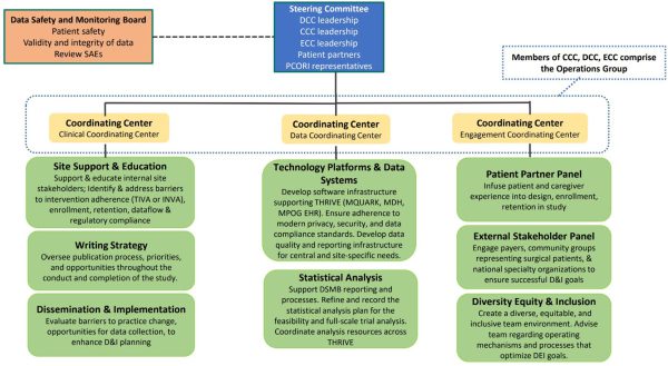 THRIVE is built on a multi‑layered, collaborative leadership and working‑group structure designed to drive coordination, accountability, and scientific rigor across every phase of the trial. This integrated framework brings together experts, stakeholders, and community partners to ensure that decision‑making is transparent, operations are efficient, and the trial is positioned for long‑term success.